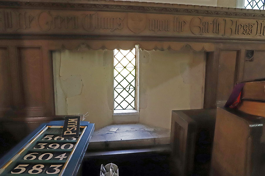 North chapel. The low window is towards the eastern end of the chapel. Unusual for a low side window, it opens into the eastern end of the north chapel. This may have been a "private" confessional provided for the Lords of the manor which sits to the north of the church.
