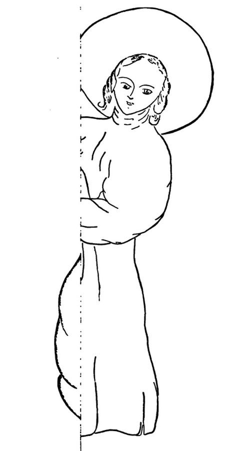 "... this window was one of more than usual importance; for when the grout work was cleared away from the splayed niche formed in the thickness of the wall, the splays were found to be smoothly stuccoed, and embellished with outlines of considerable elegance, in deep carmine; the Virgin and Child being represented on the east side, and a female figure, coronetted and kneeling with the hands joined in prayer, on the west side. Each of the heads is encircled with an aureole, that around the Saviour’s head being broken into rays." 1