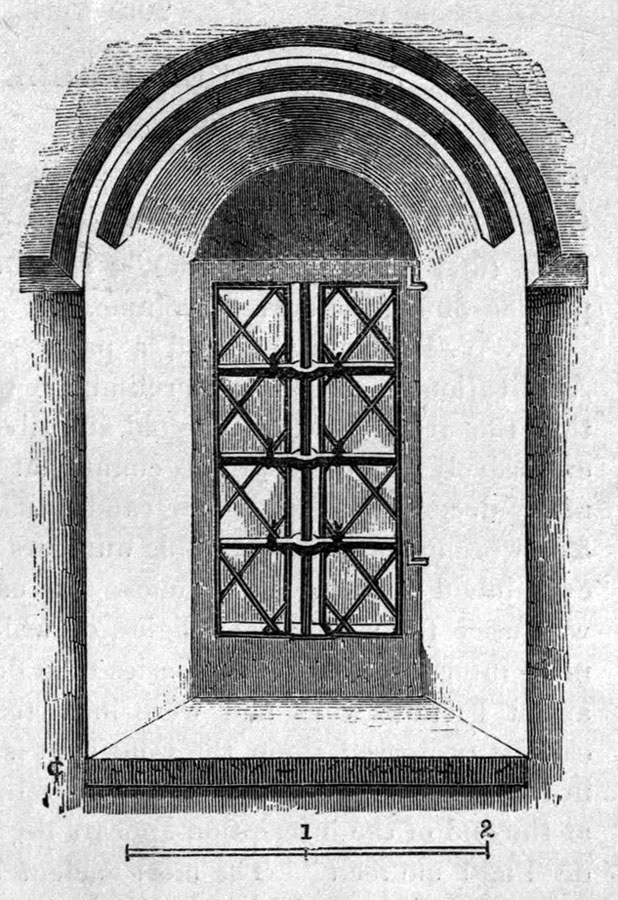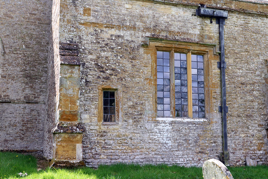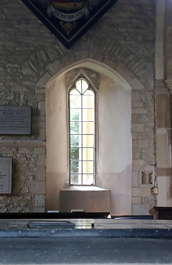 1. Assoc. Arch. Soc. Rep. xxix, 339. The sill is 3 ft. 10 in. above the floor. The opening is 14 in. wide splaying internally to 3 ft. 10 in., and its height is about 5 ft. The transom has been cut away and the whole opening glazed: see also Sir Henry Dryden's MS. notes in Northampton Public Library.
