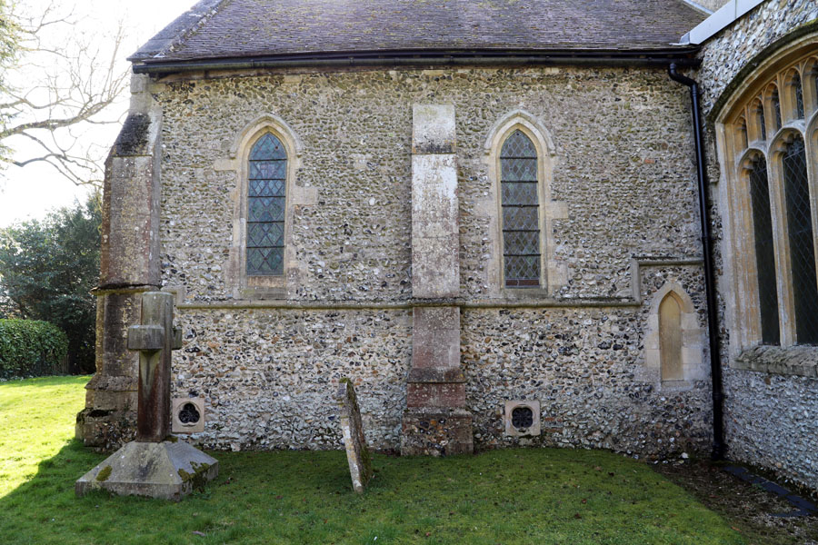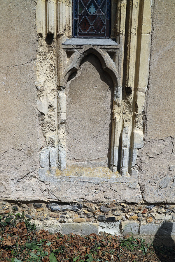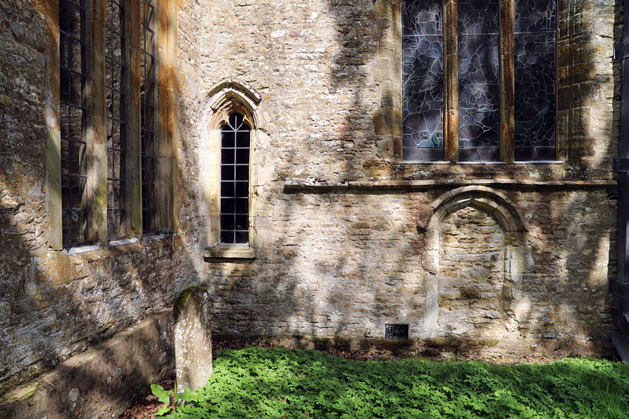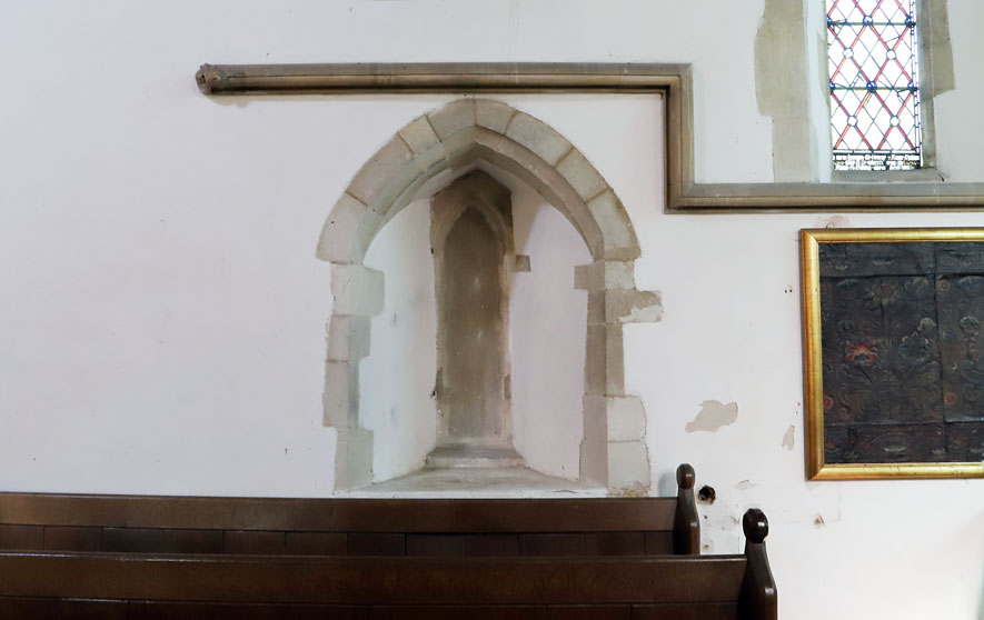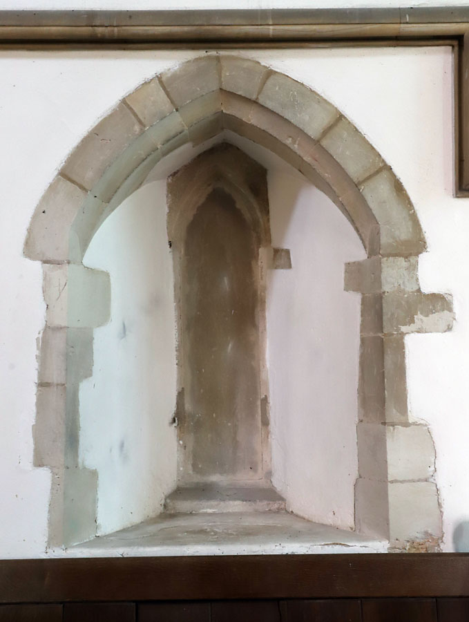 Detail of the south window, now blocked. The chancel is likely to have been rebuilt, or at least remodelled in Early English style in the 14th century. A church guide written by Robin Hanford in 1990 mentions the loss of at least one rector, Fulio de Baroun in 1361, speculating that it was the return of the Black Death in that year that took him away.1 His successor, Richard Baxter, survived until 1368, coincident with another outbreak of the pestilence. If, as is postulated here, that the majority of low side windows were installed as a reaction to the Black Death, this further reinforces the dating of the low side windows.