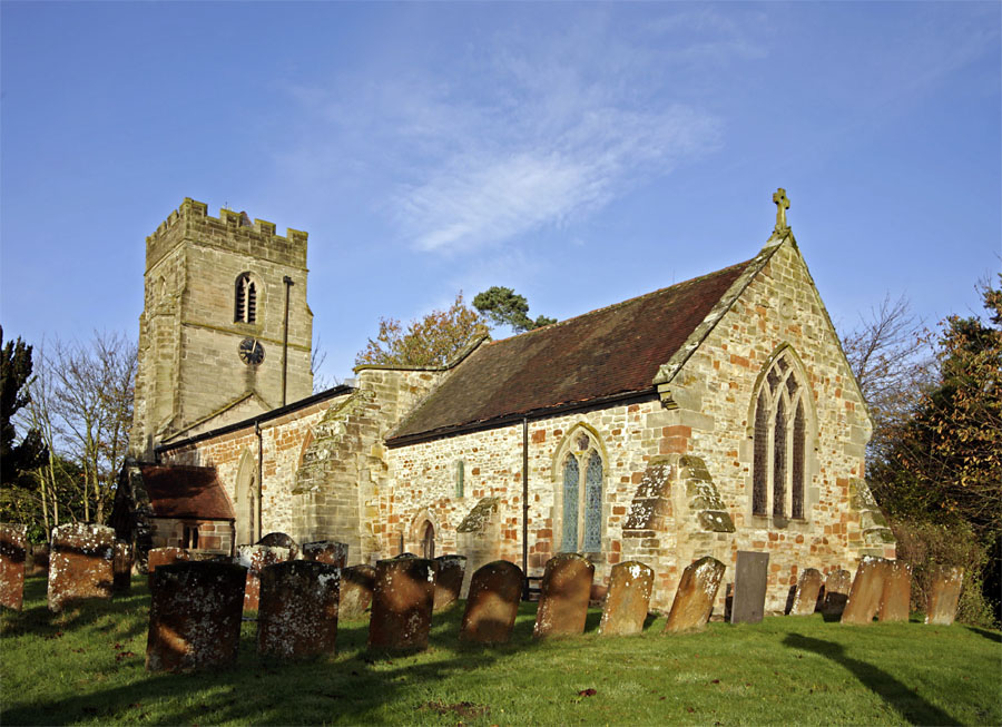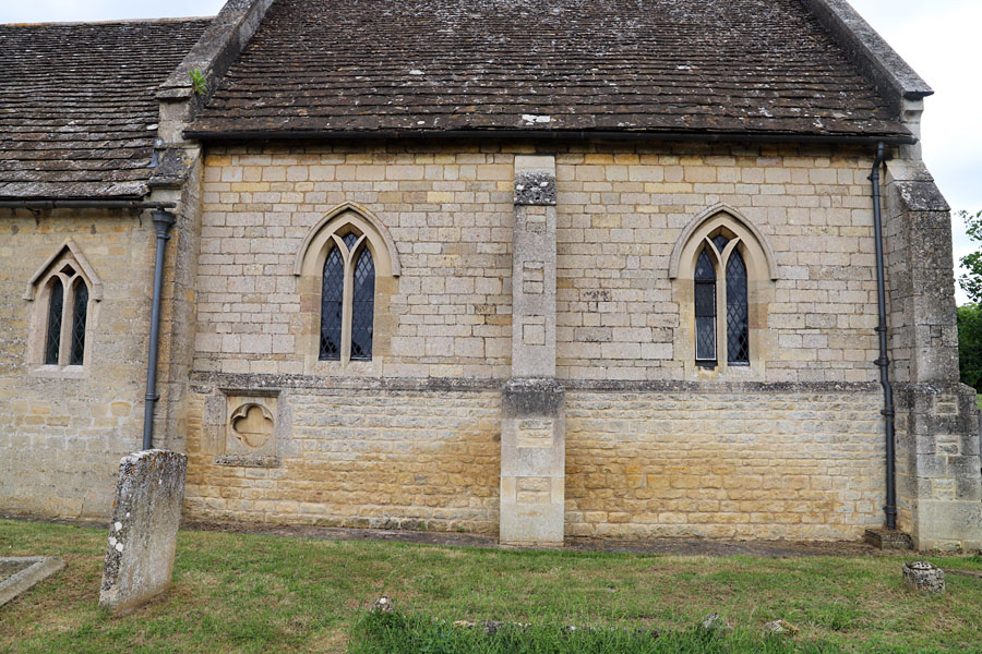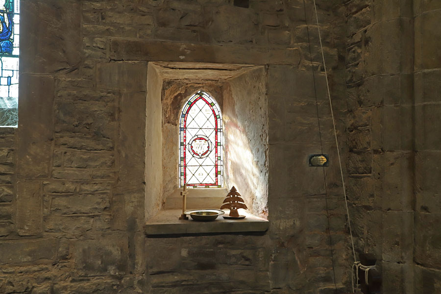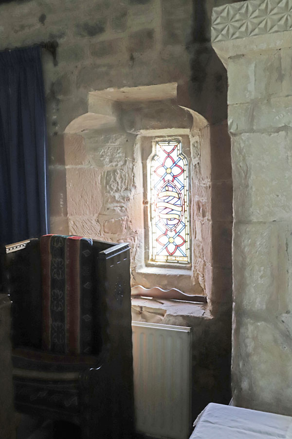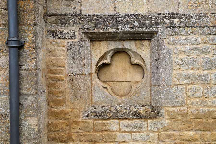 The low side window on the south side of the chancel is a pretty quatrefoil opening set in a scalloped circle and carved from a single block of stone.