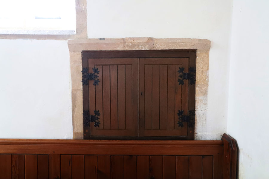 Although this lower opening seems very low by comparison to many other examples, so low in fact that the penitent would have had to have sat on the ground to be heard, it is not out of the question that the ground around the church has increased in elevation over the years. Handford mentions that a restoration in the 19th century raised the floor of the chancel.2