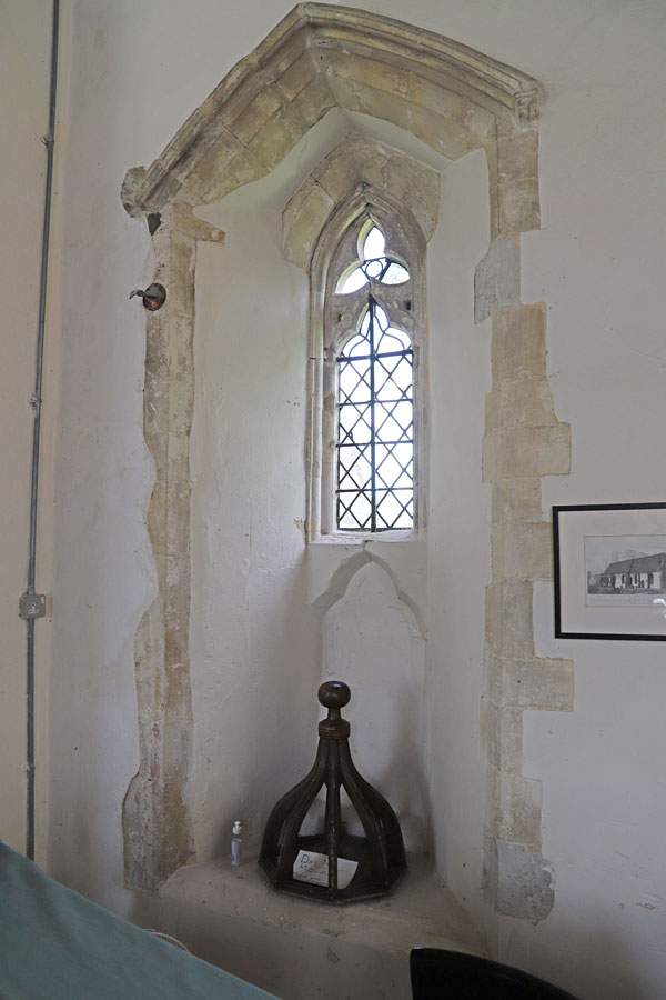 Internally the deep splay of the window provides a seat. Notwithstanding the 19th century modifications to raise the height of the floor in the chancel, this is at a comfortable height, It is likely that in the 14th century the outside ground level was similar to that of the chancel floor.