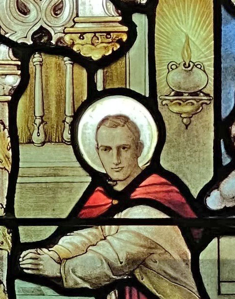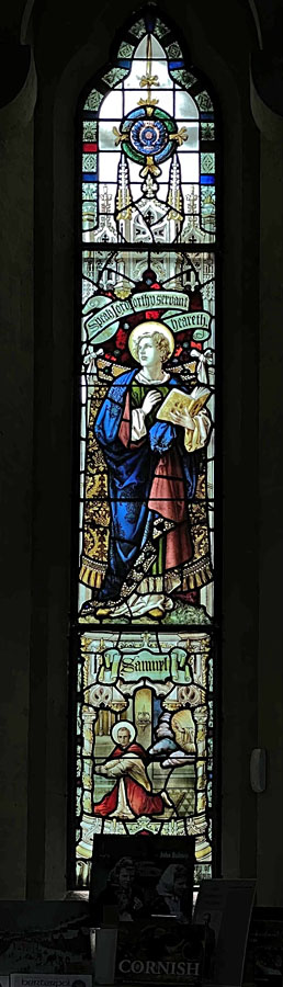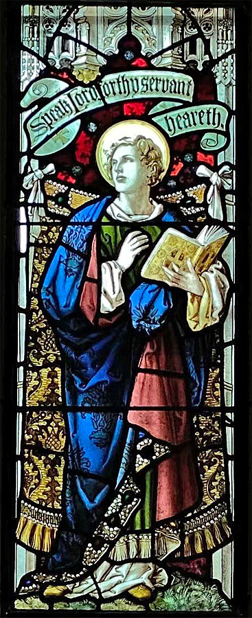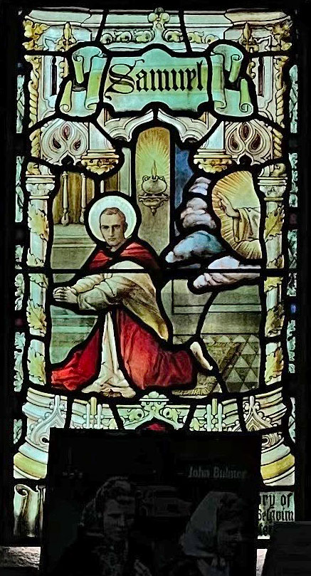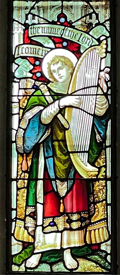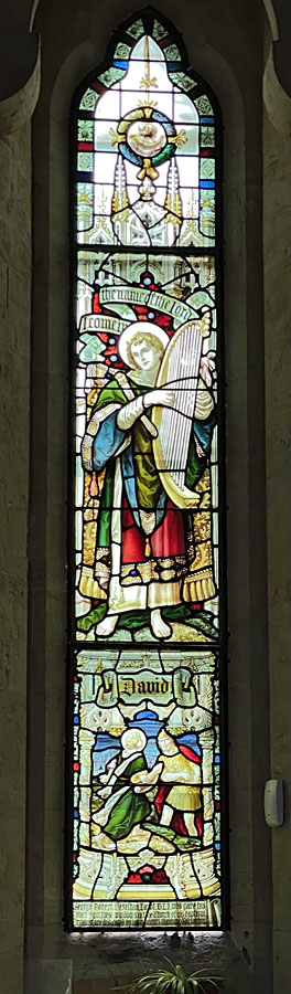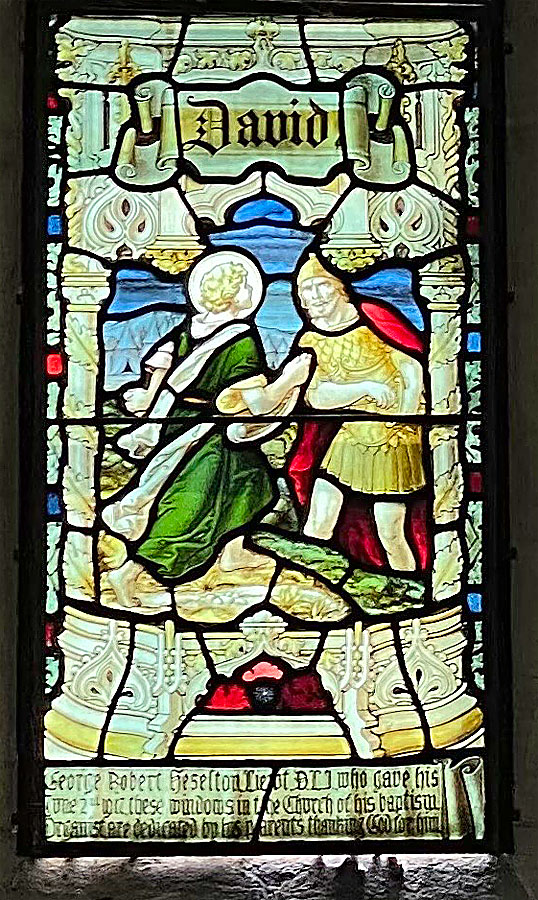 The left light represents the standing figure of the prophet Samuel above whom a scroll reads; "Speak Lord for thy servant heareth" (1 Samuel 3:9). Beneath the figure of Samuel, within a niche is a robed, kneeling figure - the face being a faithful portrait of Lt. Heselton. In the right light is a representation of David playing a harp above whom the scroll reads, "I come in the name of the Lord" (1 Samuel 17:45). At the base of this window, typical of Percy Bacon's war memorial work, and also within a niche is a narrative scene representative of David confronting Goliath. At the top of the lights are the insignia of the Royal Fusiliers (George Heselton is listed on the IWM site has having served as a private in the Royal Fusiliers, 19th Battalion, 2nd Public Schools), and the Durham Light Infantry.
