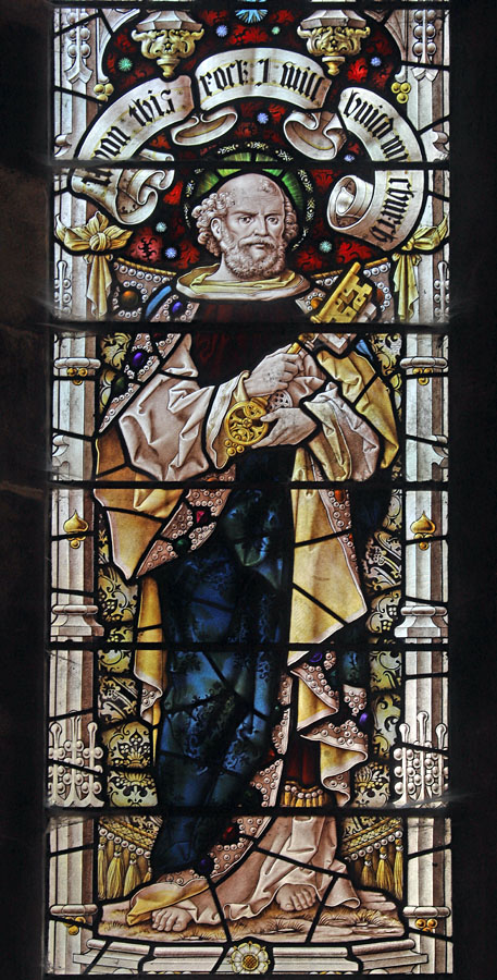 Bacon goes on to describe other elements of the window's design, the tracery lights and other details which were faithfully executed. The main difference between Bacon's description and the finished window is the substitution of another saint in the rightmost light, and an altogether different inscription on the scroll above the figure. This figure is a little ambiguous. He is clearly a tonsured monk (though dressed in rich clerical robes), and he holds in his left hand a martyr's palm, and in his right a bag. What the bag contains is moot. If stones, then this could be a representation of St Stephen, the first Christian martyr. Above the figure the scroll reads: "Bear us one another's Burden" (Galatians 6:2). Unfortunately the correspondence in the Lincolnshire Archives does not shed any light on this change, who instigated it, or when. All the figures stand within Bacon's trademark architectonic niches which are overly fussy and flamboyant in this window. In his letter to the Rev. Goodacre, Percy Bacon rather cryptically says that the design was a copy of No. 4081, though no similar design has yet come to light.