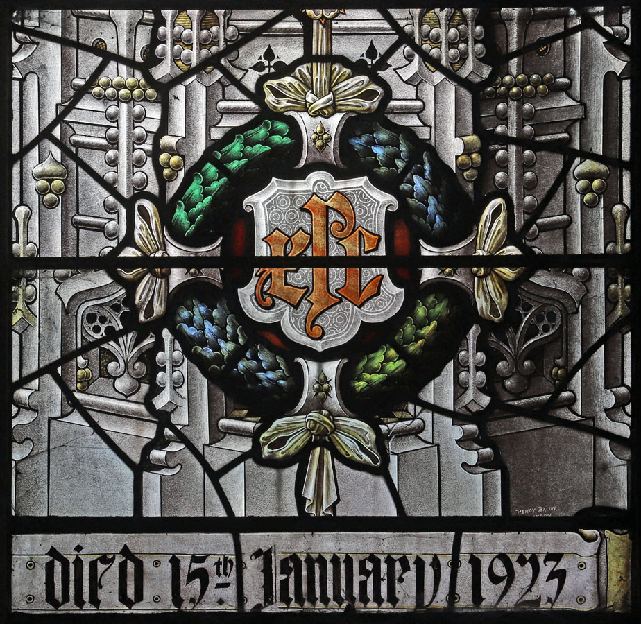 The window is signed, PERCY BACON ...LONDON, but part of the signature is obscured by the leading at the top of the inscription panel.