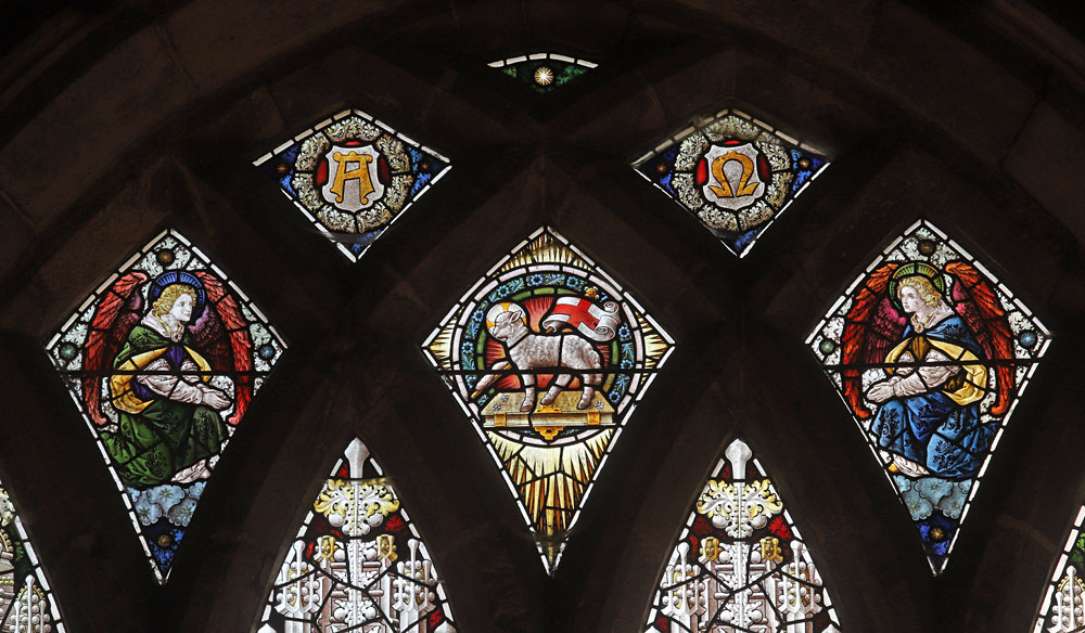 In the tracery are the usual Alpha and Omega symbols, and below those two adoring angels flanking an Agnus Dei standing on the "Book sealed with Seven Seals".