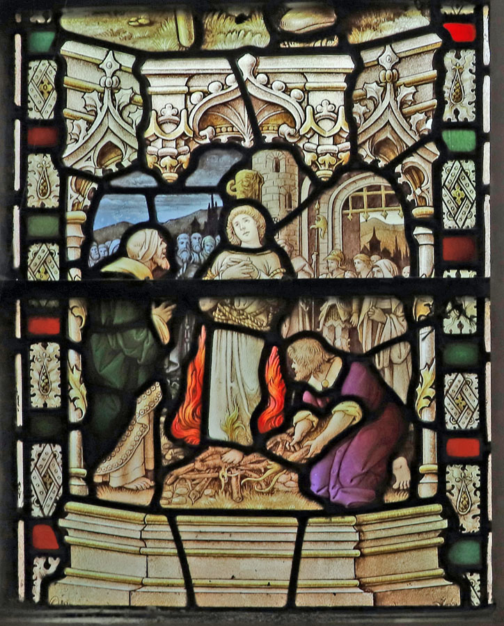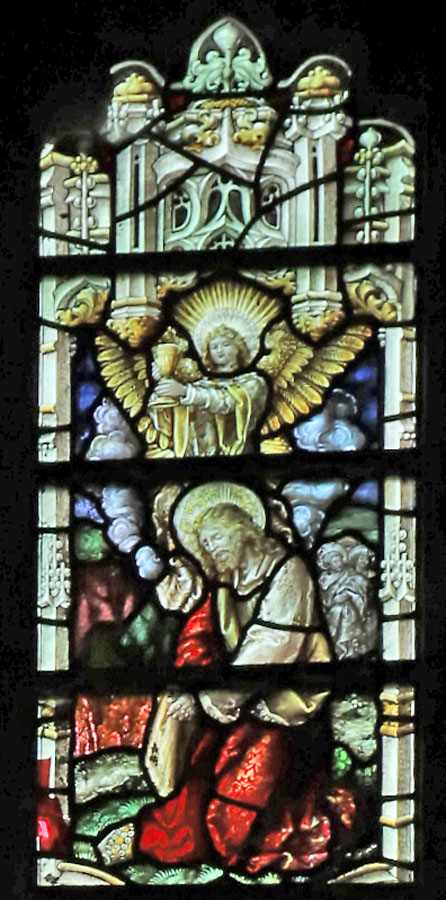 This is one of eight identical two-light windows in the south and north aisles of St Mark's, three of which were filled by the Percy Bacon Studios. All three follow the same design, with the standing figures of saints in the top of the main lights, and in the predellas representations of an event in each of their lives. Very similar designs were used in St Columba's, St Columb Major, and St Lalluwy's, Menheniot, both in Cornwall. George Fellowes-Prynne was the architect engaged to renovate these churches in 1900-1905, and 1925 respectively, and he engaged Percy Bacon to supply stained glass.