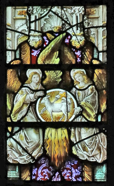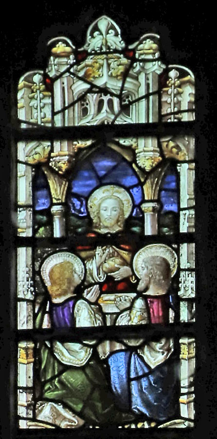 This three-light window by Percy Bacon Limited mirrors that in the north transept. It depicts as it's central theme, the last supper. At the top of the outer lights there are scenes depicting the Supper at Emmaus and Agony in the Garden. At the top of the central light an angel holds a scroll on which is written, "Ecce Agnes Dei" below which two more angels hold a shield emblazoned with the Lamb of God from which golden rays pour down towards Jesus. At the base of the central light, "Do this in remembrance of me".