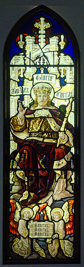 The window, a single lancet, is most definitely from the studio of Percy Bacon. It was part of a series of windows for St Saviour's, Alexandra Park, installed in circa 1905 - 1908. This window was installed in 1905.2 The window's subject is Christ in Majesty, seated in front of the usual elaborate niche with wide columns in white glass. Above him on a scroll are words from the Te Deum, "Tu Rex Gloriae Christe". At the base two angels hold a scroll with the words, "Sanctus, Sanctus, Sanctus".