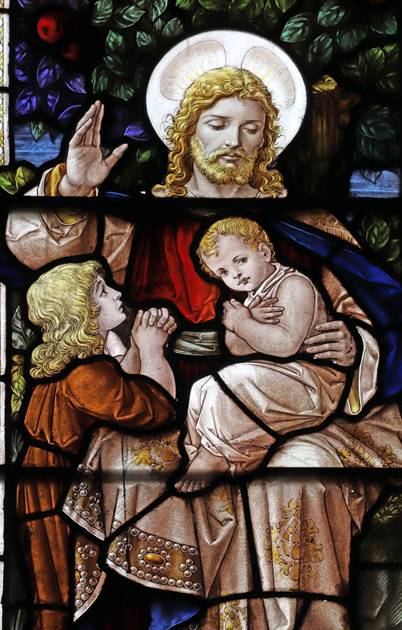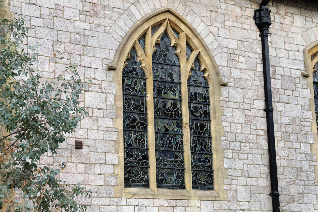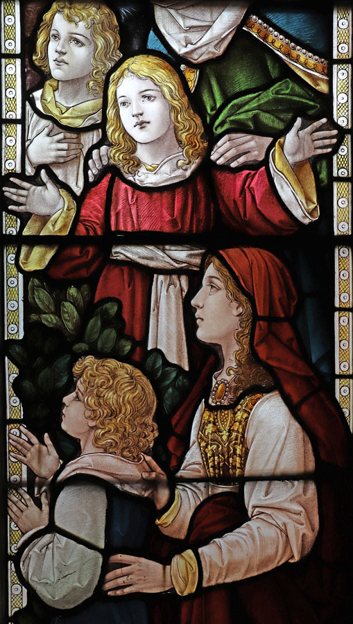 Like the great west window, this one is only visible in full from the first floor of the boxed-in west of the nave. Sadly it is partially obscurred now by a rail and glass barrier installed to prevent inadvertant damage, as it's base is level with the new floor. The window is of three unadorned lights with simple tracery and depicts Christ blessing children. The window was almost certainly not painted by Percy Bacon himself, and the style is so different from Bacon's other works illustrating this subject (e.g. Mickleham, Surrey, Repton, Derbyshire, and St Wenn (SA1), Cornwall) that it is likely he didn't pen the cartoon either. Unlike those windows there are no elaborate niches, the lights being edged simply with rectangular white quarries, and the background is filled with a simple floral motif rather than naturalistic landscapes. Similarly the larger of the tracery lights are filled with lilly and rose motifs.