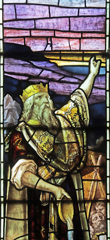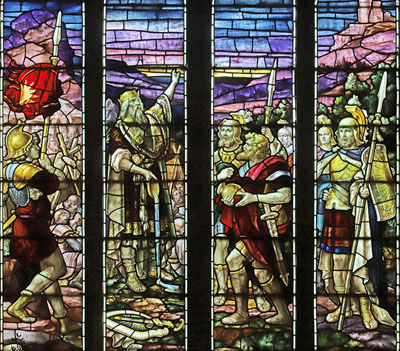 The scene fills all four lights and is remarkable in its colouring and detail. The main character of David occupies the second from left light while the others are filled with the men in his army. He holds a bowl from which the water falls to the ground. In the immediate background other soldiers look on from their tented encampment. Behind David two of his soldiers appear to be sleeping in their tent. On the right is a castle on the hill, possibly representing Bethlehem where David's enemies were camped. In the tracery angels holding lilies, signifying peace, and a sword and spear signifying war look on.