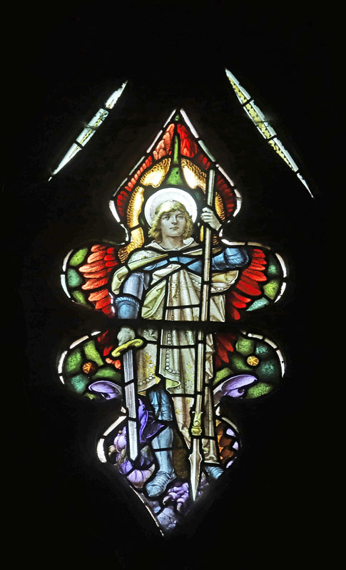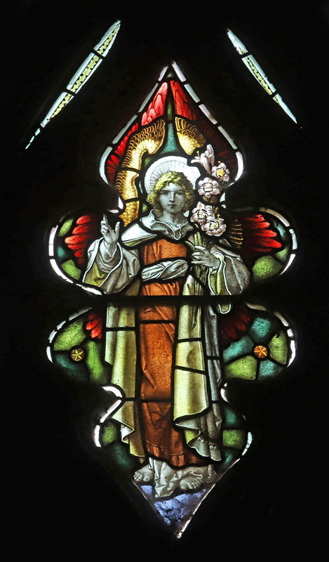 There is very little of the white glass often used by the Bacon Studios style, and this window is, in may ways, similar to those in the north aisle of Lady St Mary, Wareham, Dorset, and the east window at St Andrew's, Kirkby Malzeard, North Yorkshire. The scene is strictly narrative, boldly coloured and dark. The whole scene with its many characters occupies the entire width, ignoring the mullions. It is very likely that this window was painted by a third party, and not by Bacon himself. The window is reported to have been executed under the supervision of Mr E. de H. Holding, a Northampton architect,4 and is possible that the departure of style was influenced by him.
